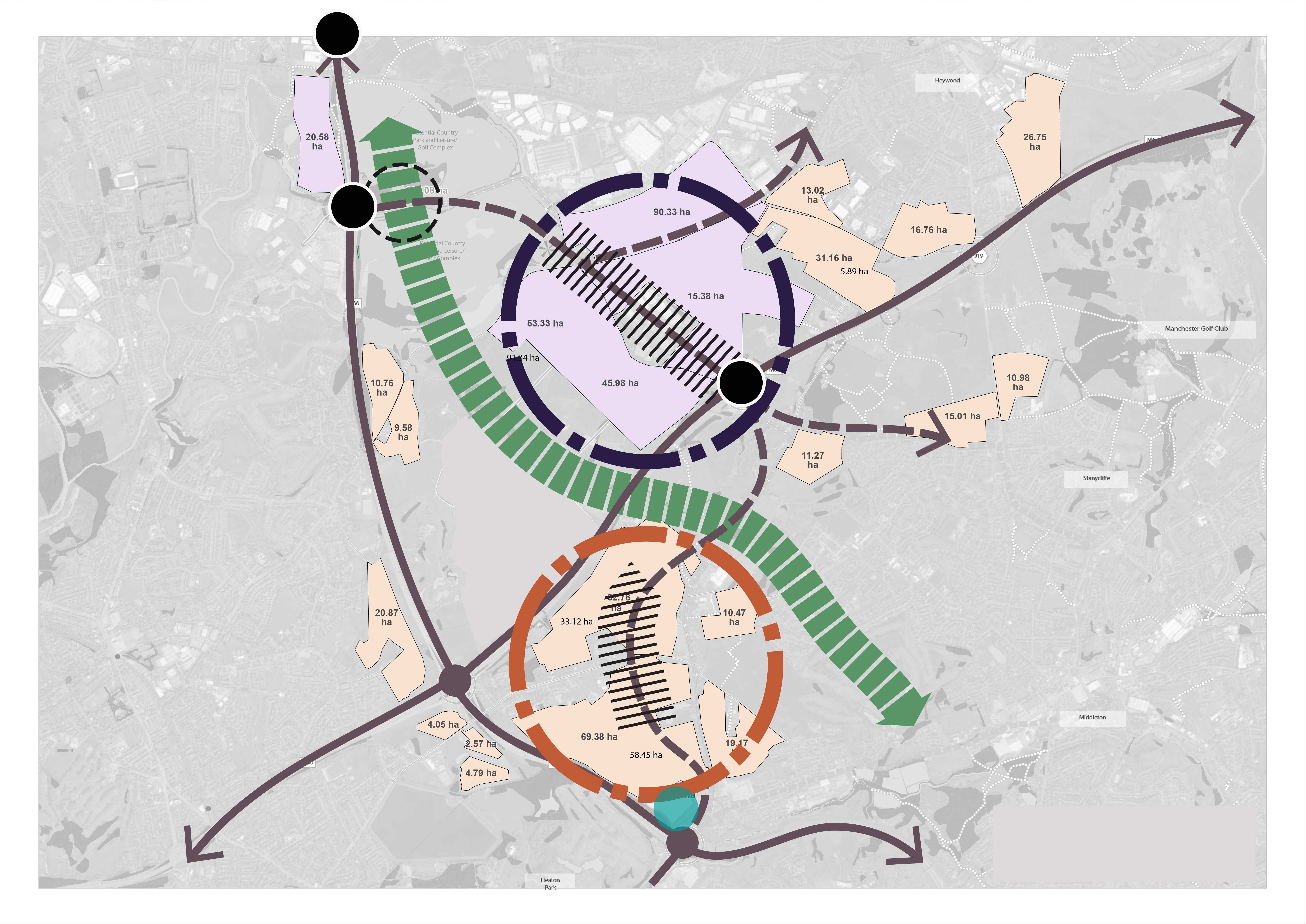 The green gateway in the north linked from a remodelled junction on the M62, via a parkway employment zone to an advanced manufacturing park/university zone, giving a total employment area of over 300 ha. and 50,000 new jobs. The southern community hub united education, health, retail, and leisure uses at the heart of a new community of over 10,000 homes. This area is connected by a dedicated public transport corridor, including a Park & Ride in the south and motorways in the north.