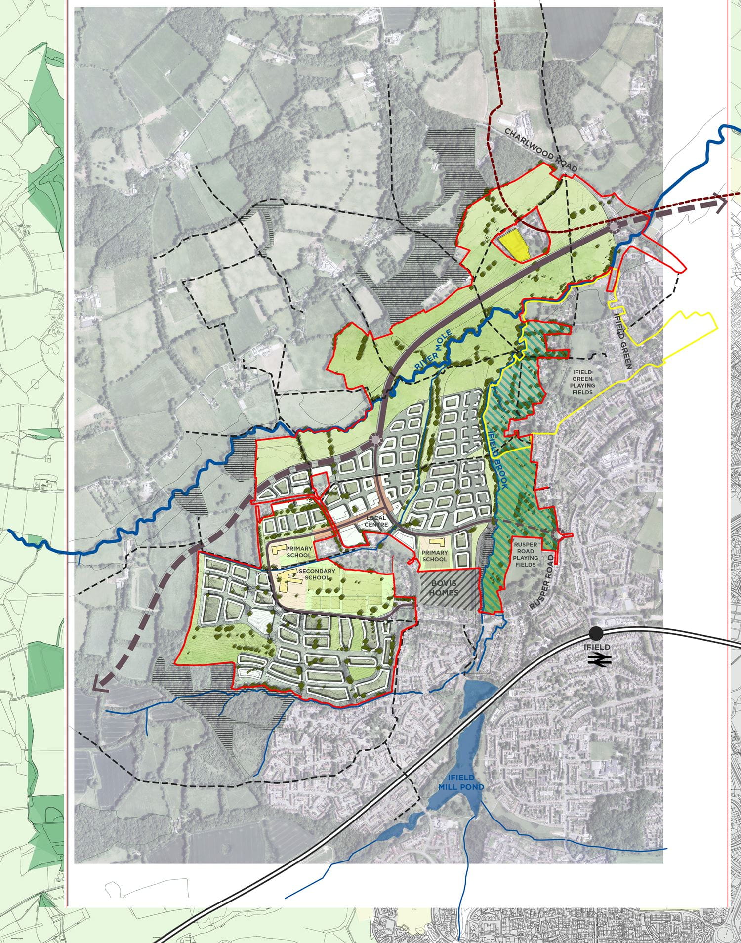 Carter Jonas were commissioned by Homes England to plan this 190 ha. site as a comprehensive urban extension of the town. This includes taking note of Gatwick Airport’s planned expansion, the proposed West Crawley Relief Road, a complex flood relief strategy, and protecting the setting of old Ifield village.