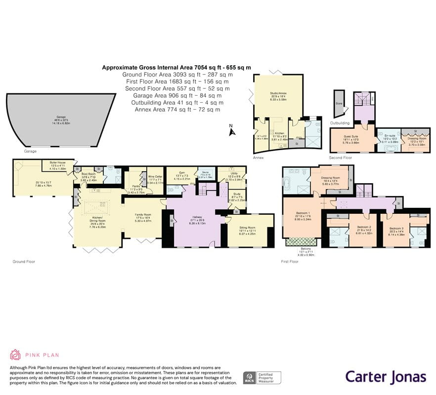 The beautifully presented interior is arranged over three floors and provides a wonderful family home with spacious and flexible accommodation extending to over 5000sq ft. Forming the stylish contemporary extension, the impressive kitchen/dining/family room forms the hub of the house with views stretching over the stunning gardens to the front and beyond. This fabulous living space has an abundance of natural light with a large remote controlled sky light in the kitchen and bi-fold doors, which completely open to the terraces providing a seamless, uninterrupted summer entertaining space. The kitchen by Bulthaup, boasts an extensive island, wine fridge and hob incorporating a wok burner, induction rings and a griddle, along with two steam ovens, Vax pack drawer and a coffee station. Adjoining the kitchen are a fully fitted temperature-controlled larder with an adjoining temperature-controlled wine room. In addition to the open plan kitchen/dining/family room on the ground floor, occupying the original part of the house, are two further reception rooms; an entrance hall/sitting room and a media room, both with real flame gas fires, a study, laundry room, cloakroom, gym with shower and sauna, and a generous boot room and wet room arranged off the kitchen.